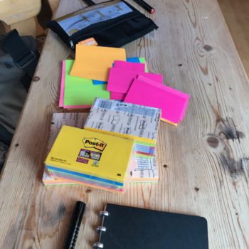 Auf der Hütte angekommen, sammelten wir die Themen auf Post-it Notizen, die jeder von uns allein durchdenken oder mit den anderen diskutieren wollte. Ich schrieb all die Sachen auf, die mich in den letzten Wochen „gequält“ haben. Gequält, weil ich die Zeit einfach nicht gefunden habe, sie genauer zu betrachten: „Storytelling Prozesse visualisieren“, „Fokusprojekte definieren“ „Mehr Blogposts schreiben“ „Fachbuchidee vorantreiben“.