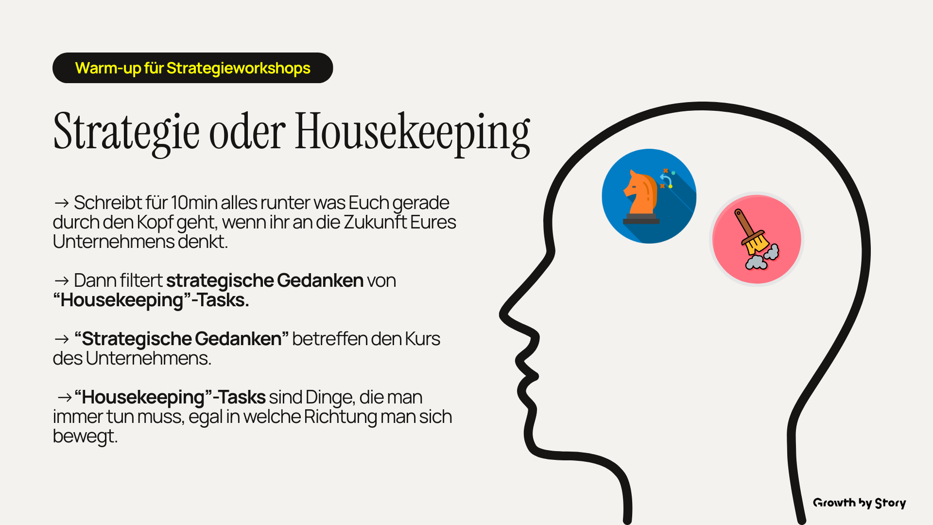 Viel entscheidender ist, dass diese Aufgaben benannt werden. Sonst schleichen sie sich entweder in die strategischen Überlegungen ein — oder die Strategie kommt nicht vom Fleck, weil sich hinter den großen Ideen ein riesiger Berg lange ignorierter Housekeeping-Tasks türmt.