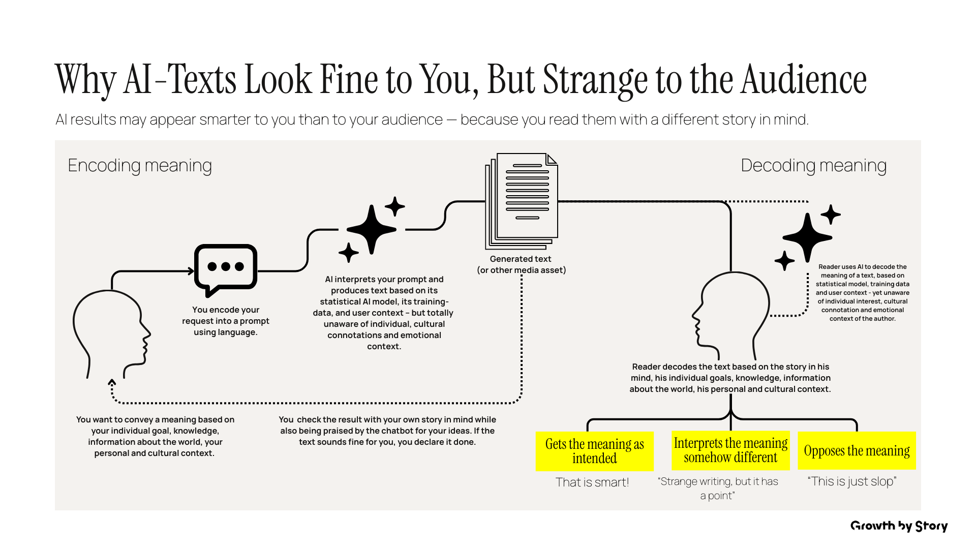 Wenn du eine KI promptest, encodierst du deine Absicht, eine Bedeutung mitzuteilen, in Worte. Die KI re-encodiert diese Absicht zu einem Text, basierend auf statistischen Mustern aus den Trainingsdaten, und eben nicht auf Basis deines kulturellen Kontexts, deiner emotionalen Situation oder dem unausgesprochenen Dingen, die zwischen den Zeilen gesagt werden.